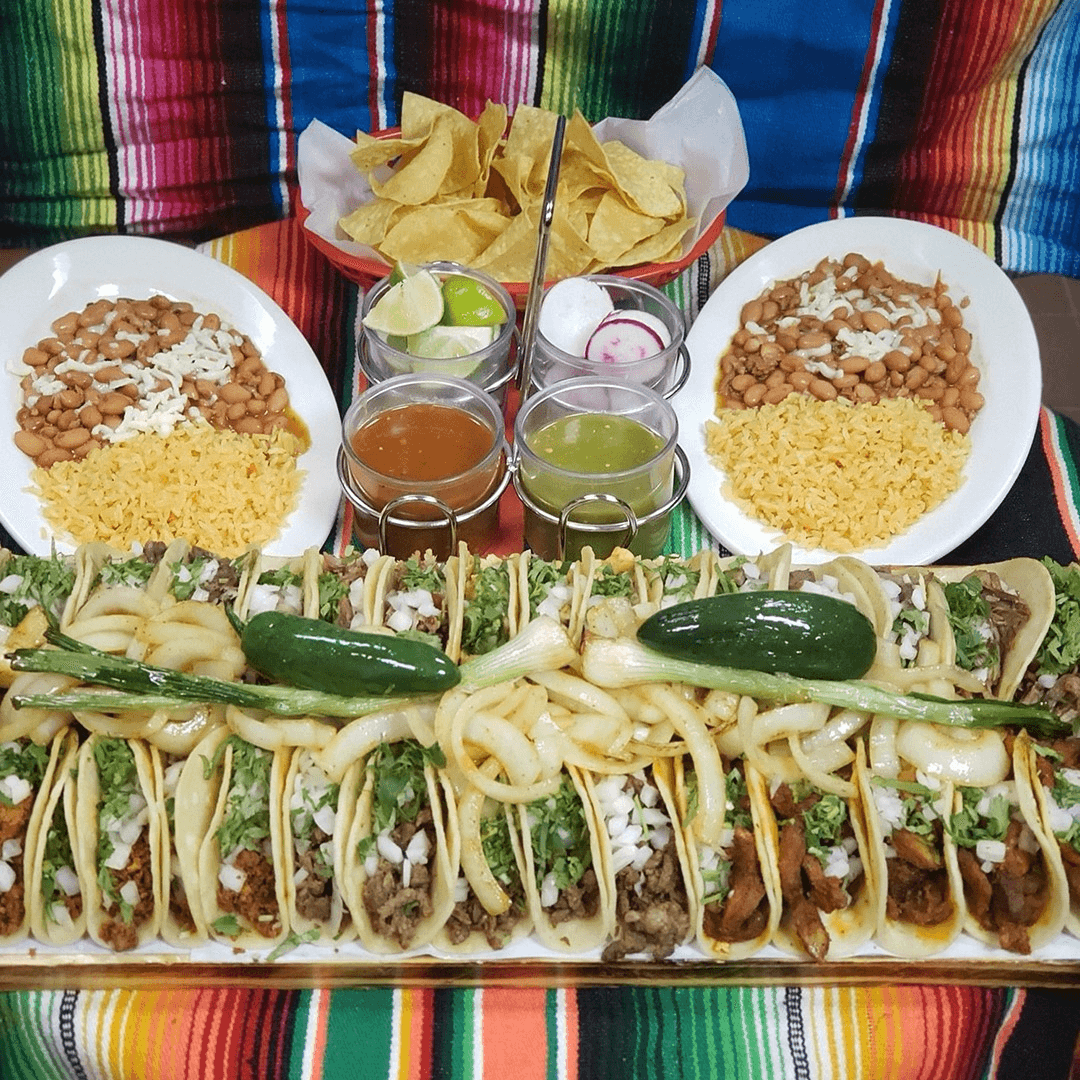 20 Street tacos with choice of meat street style served with rice and charro beans, chips salsas and garnishes