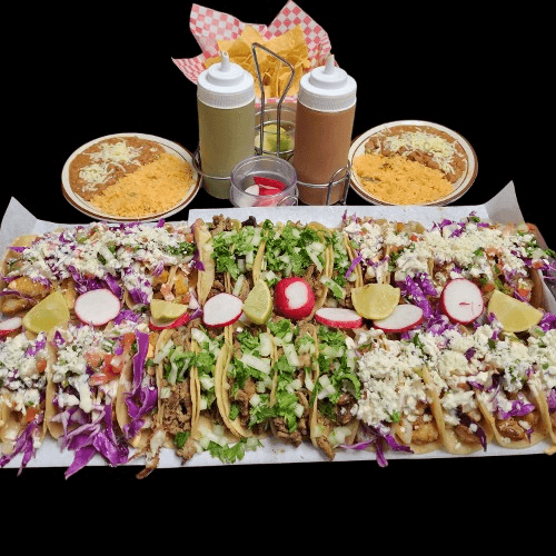 Surf n turf street tacos (10 steak, 10 fish, 10 shrimp) with sides of rice, beans, chips, salsas, raddishes, limes