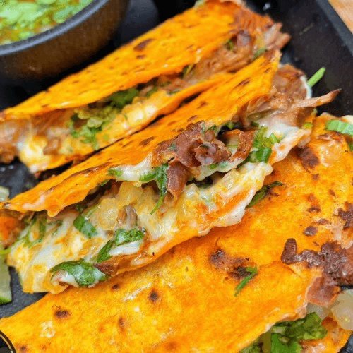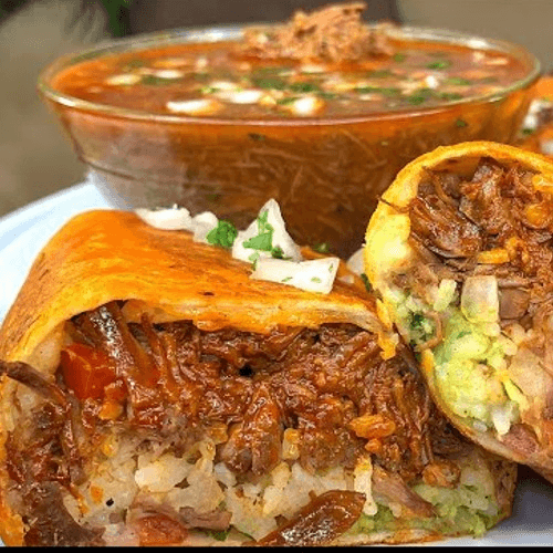 Large flour tortilla stuffed with grilled cheese homemade beef Birria, charro beans, rice, onions, cilantro and salsa verde