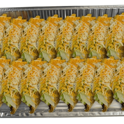 20 enchiladas with choice of meat. Topped covered with our homemade enchilada sauce and cheese. Choose ground beef, chicken tinga, cheese or bean