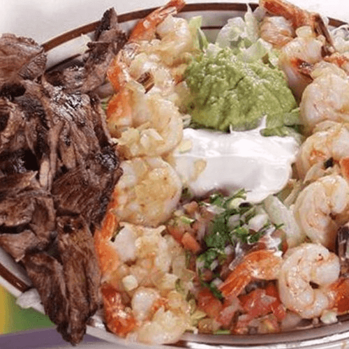 Cubed steak, grilled shrimp and chicken taquitos with sides of lettuce, pico de gallo, sour cream and guacamole. Side of rice and beans