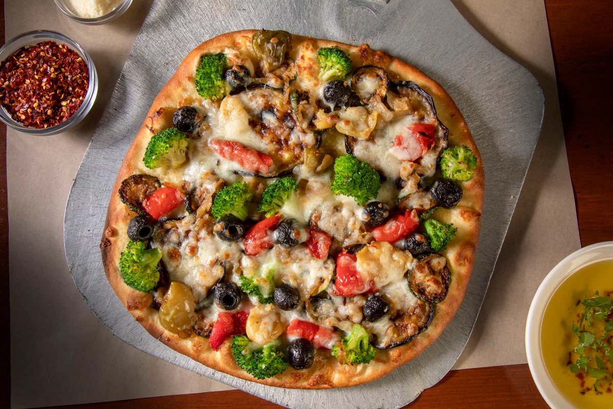 A blend of roasted peppers, eggplant, zucchini, roasted garlic, black olives, pecorino romano, caramelized onions, broccoli, & mozzarella