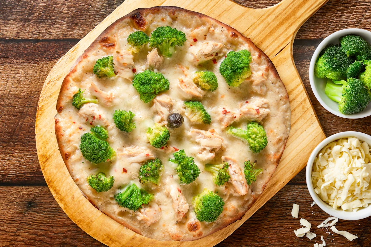 Roasted chicken, marinated broccoli, mozzarella, Pecorino Romano & lemon pepper cream sauce