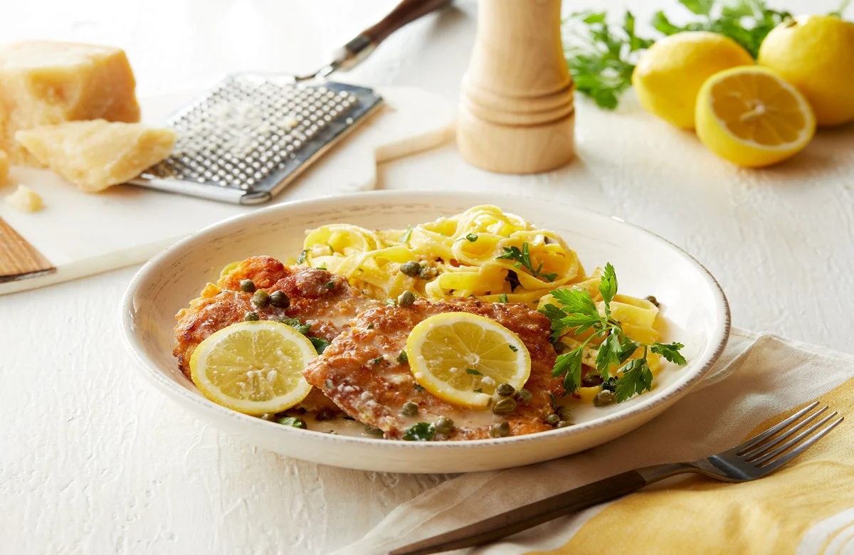 Lemon, capers, creamy white wine sauce, Pecorino Romano & fresh herbs, served with spaghetti