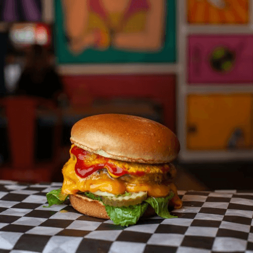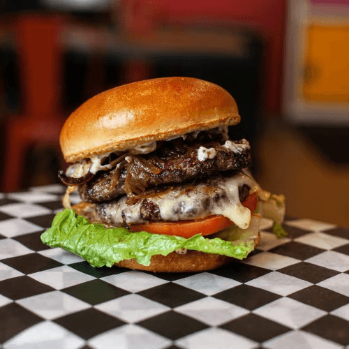 Ground beef, topped with sharp cheddar cheese, onion, lettuce, tomato, pickle, ketchup, and mustard, vinaigrette served on a toasted brioche bun