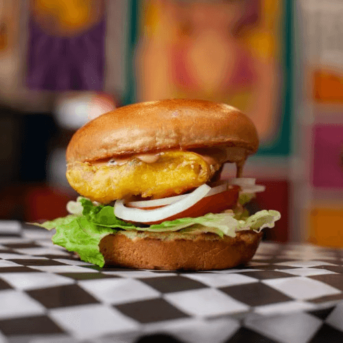 7oz Pollock filet battered in a rice flour tempura topped with lettuce, tomato, onion, and house-made mumbo tartar sauce, vinaigrette served on a toasted brioche bun
