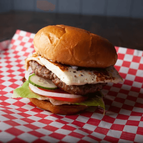 Ground lamb topped with halloumi cheese, cucumbers, lettuce, tomato, onion, and house-made tzatziki, vinaigrette served on a toasted brioche bun