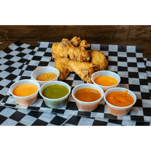 Fried chicken breast fillet battered in a rice flour tempura with your choice of sauce and topped with lettuce, tomato, onion, vinaigrette on a toasted brioche bun