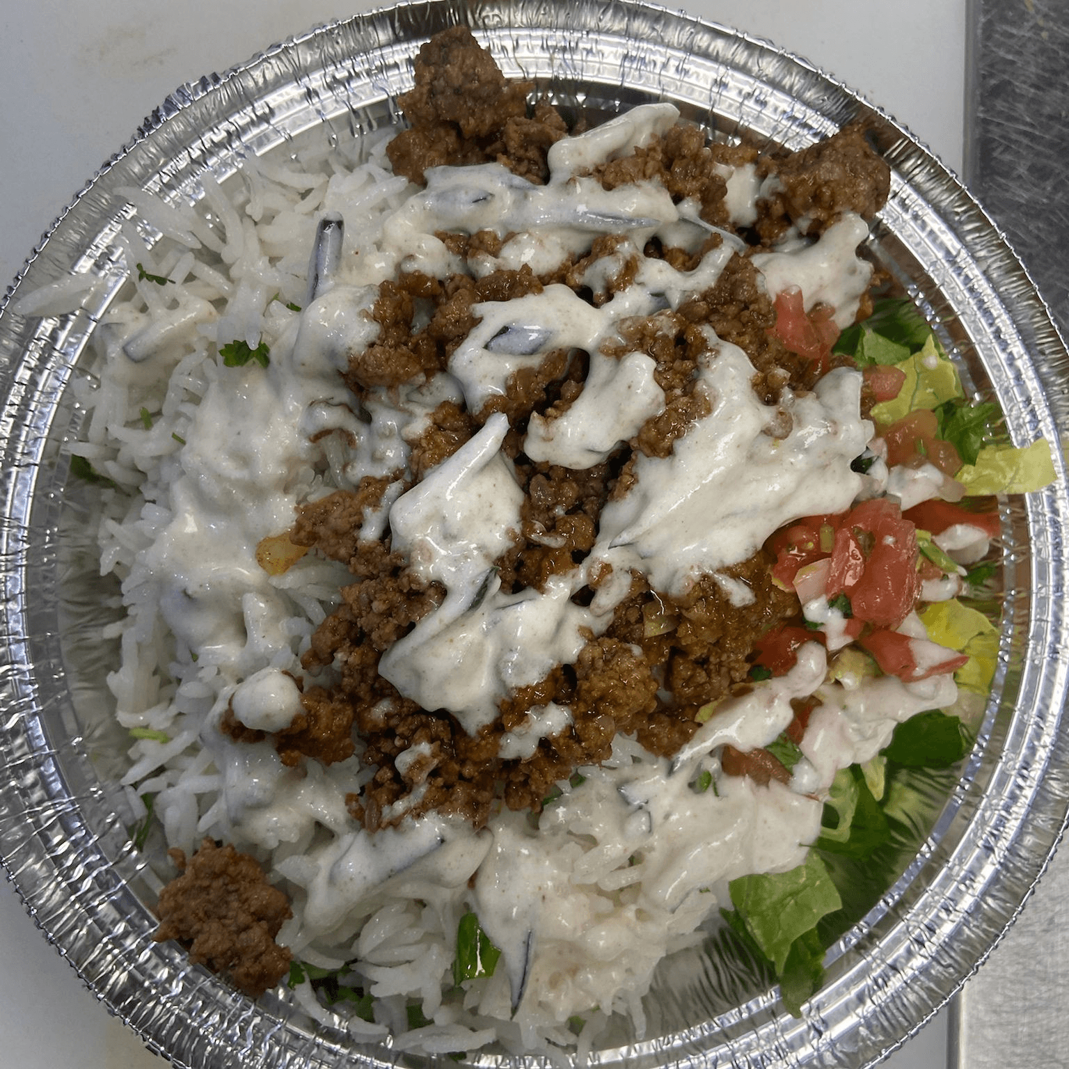 Seasoned ground beef, lettuce, and pico de gallo served on a bed of cilantro lime rice with housemade raita sauce or housemade Bengali hot sauce for a spicy option.